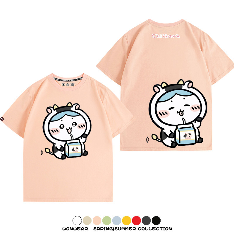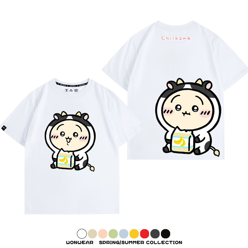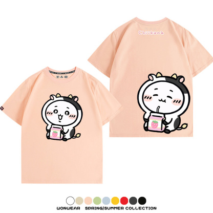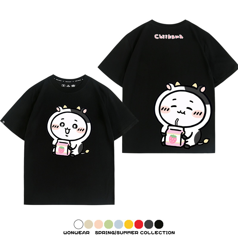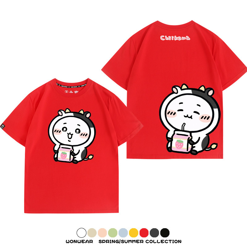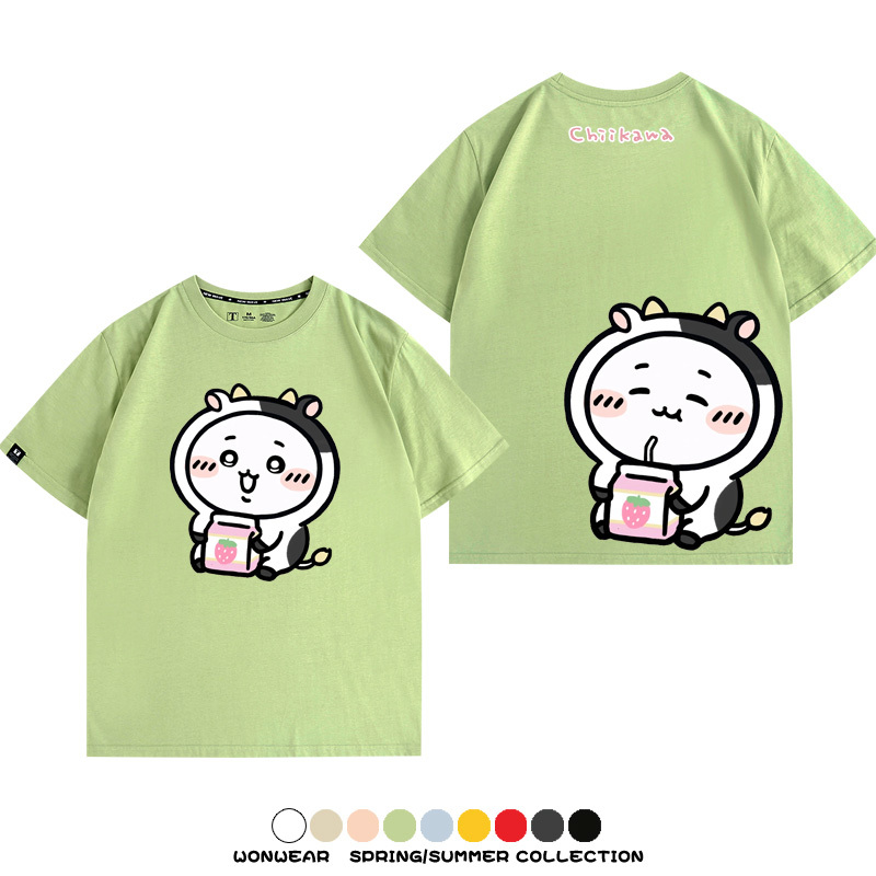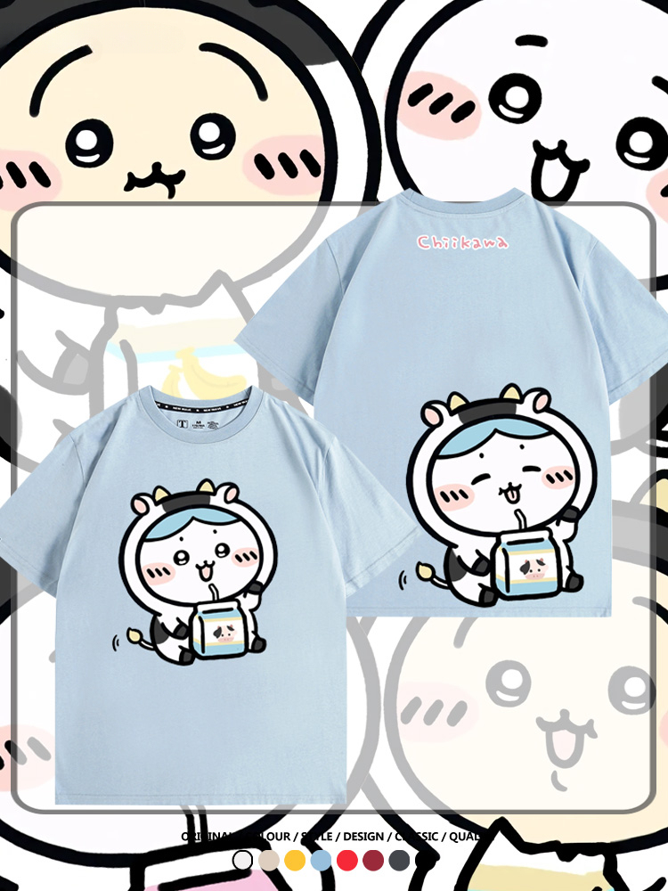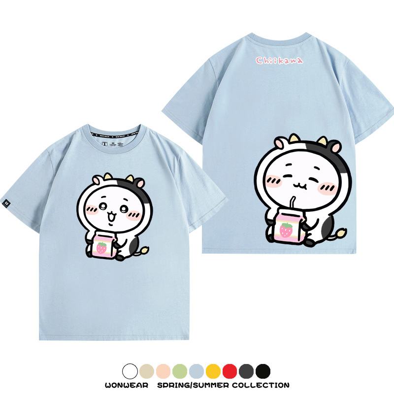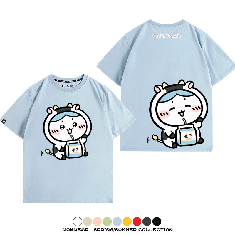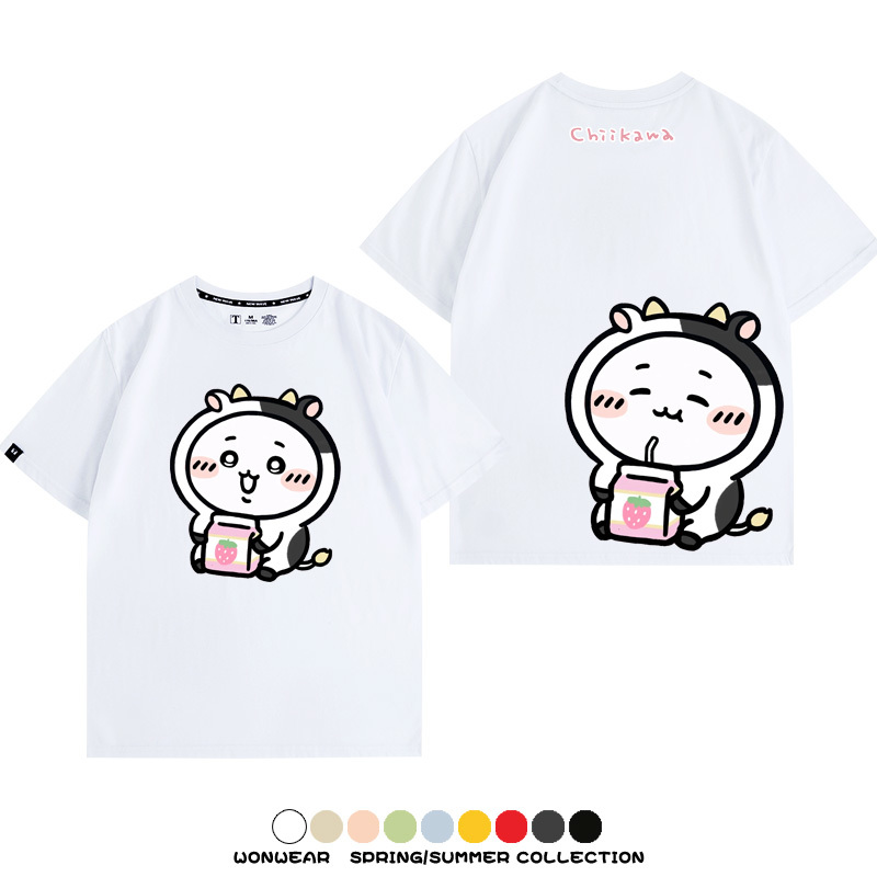 Chiikawa吉伊咔哇烏薩奇小八可愛喝牛奶二次元情侶純棉短袖夏男潮