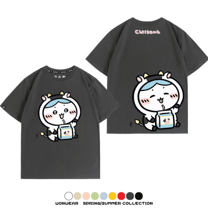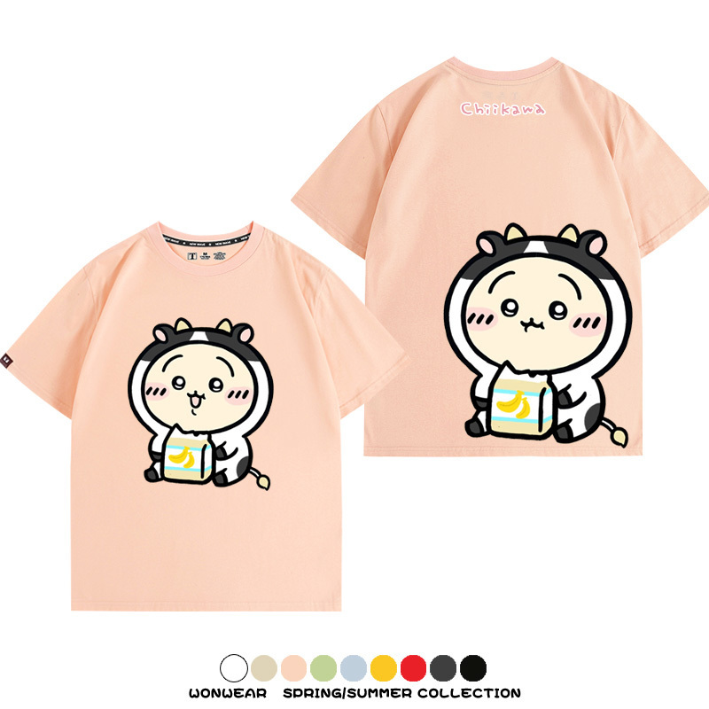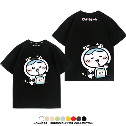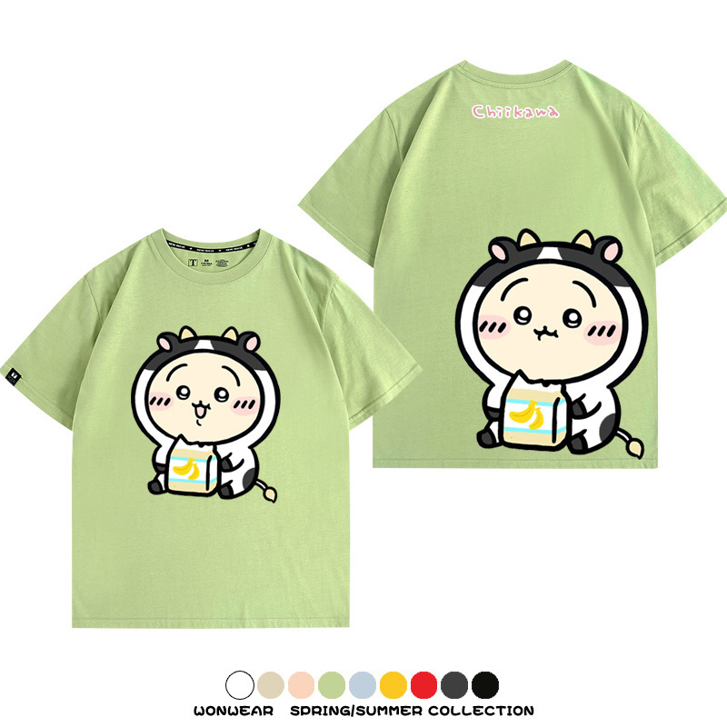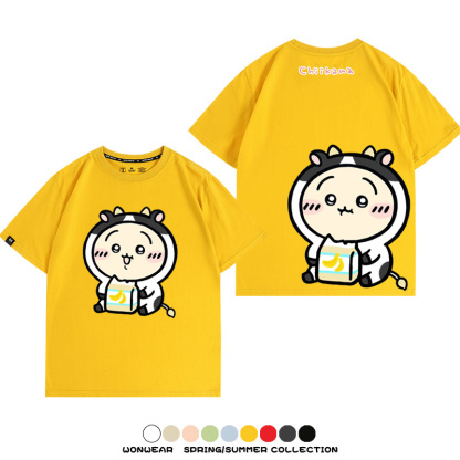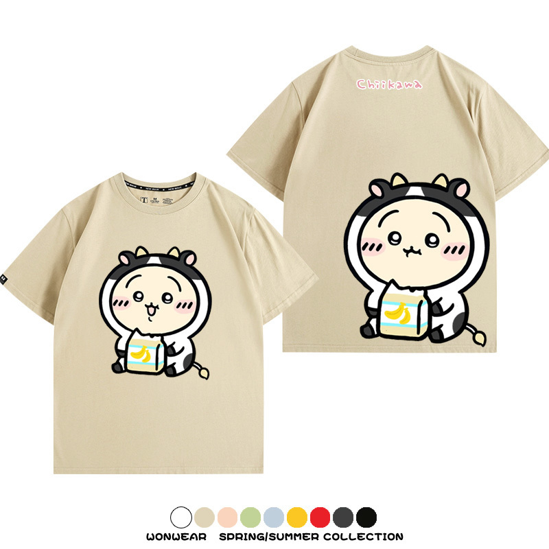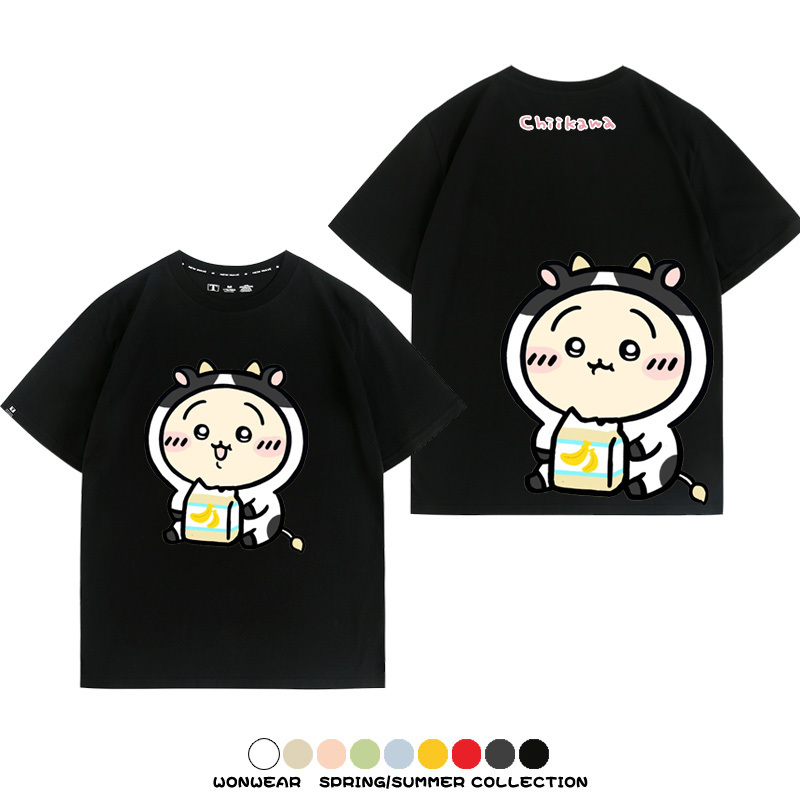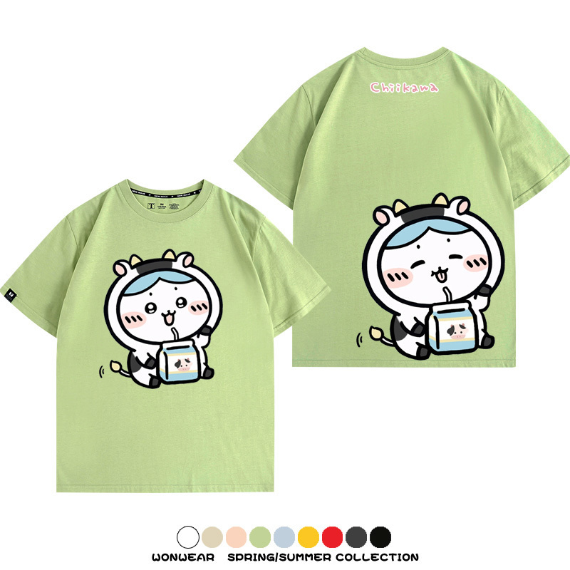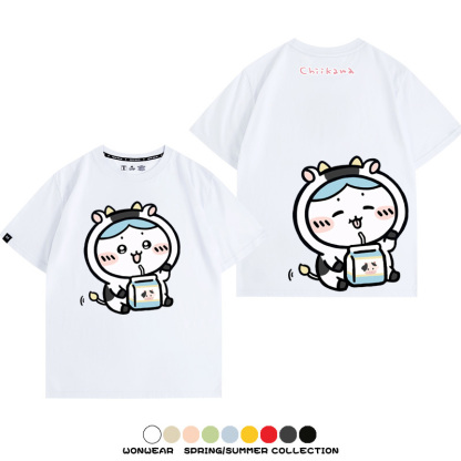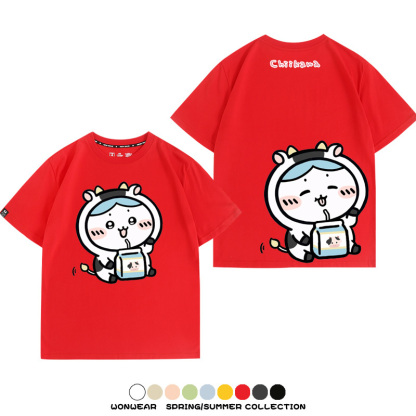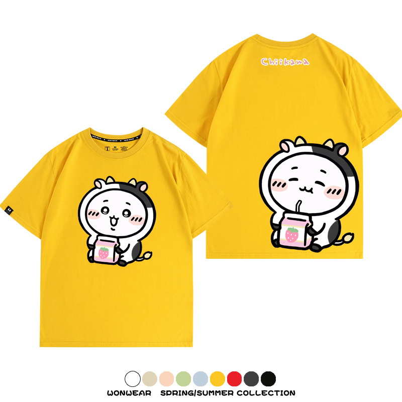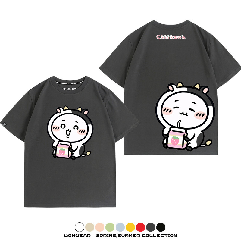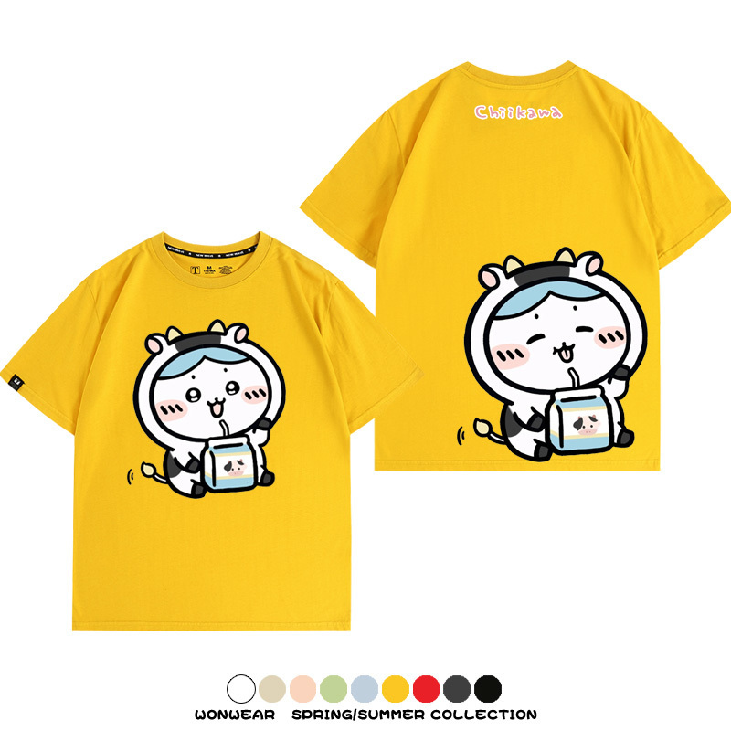 Chiikawa吉伊咔哇烏薩奇小八可愛喝牛奶二次元情侶純棉短袖夏男潮